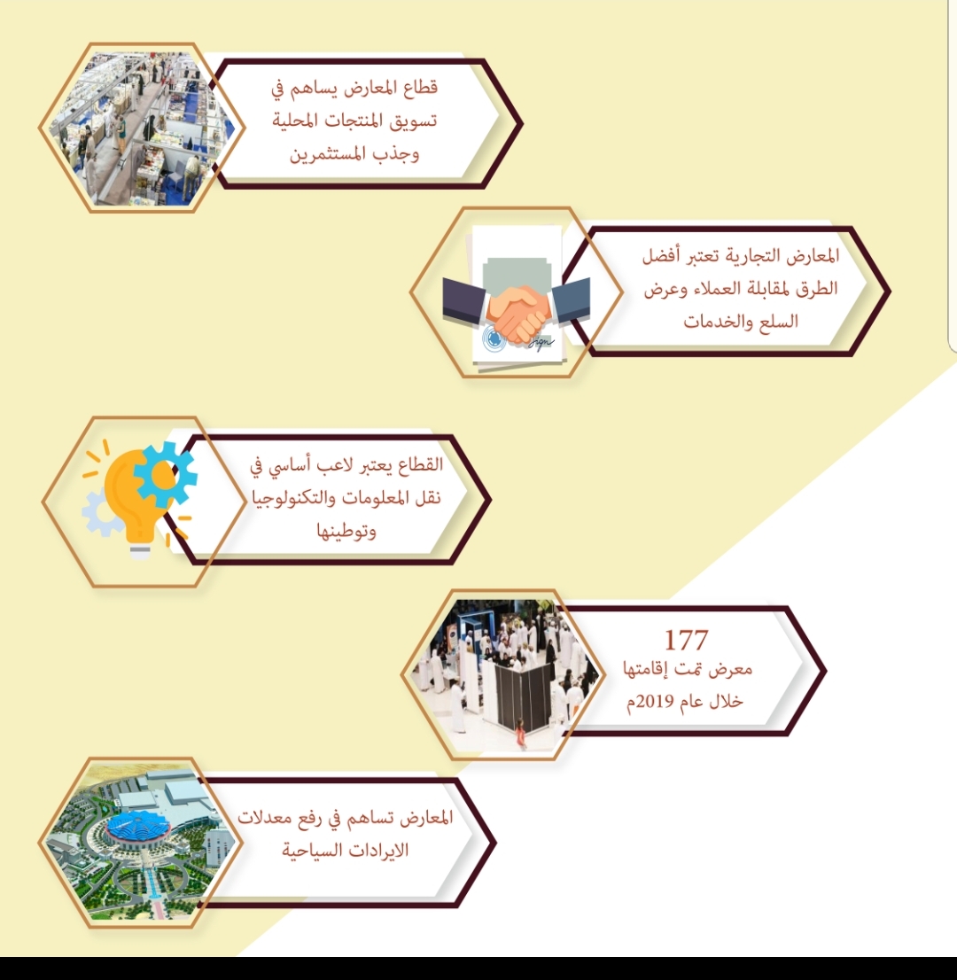 وأكدت وزارة التجارة والصناعة بأن المعارض التجارية تعتبر أفضل الطرق لمقابلة العملاء وعرض السلع والخدمات وعقد الصفقات والحصول على الوكالات التجارية، وتعتبر لاعبا أساسيا في نقل المعلومات والتكنولوجيا وتوطينها وانتشار المعرفة والممارسات المهنية، وعاملا رئيسيا في بناء التفاهم والعلاقات بين الدول والثقافات والحضارات ومن أهم أهدافها الترويج للصناعات والمنتجات الوطنية والحرفية. كما يعتبر قطاع المعارض عاملا رئيسيا في بناء التفاهم والعلاقات وتبادل الثقافات مع الدول ويساهم في ارتفاع الايرادات السياحية، واستقطاب الكثير من الاستثمارات الاقتصادية التي تصب في مصلحة الاقتصاد المحلي.