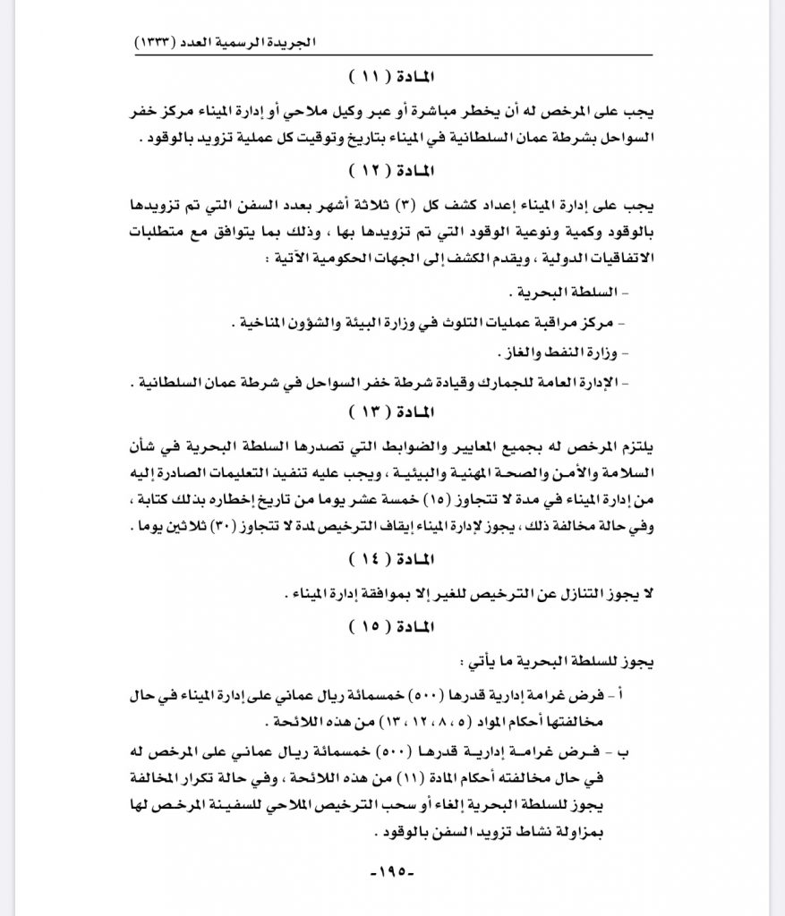 أصدر معالي الدكتور أحمد بن محمد بن سالم الفطيسي وزير النقل القرار الوزاري رقم ٣١ / ٢٠٢٠ بإصدار اللائحة التنظيمية لتزويد السفن بالوقود في الموانىء العمانية كما نشر في الجريدة الرسمية اليوم ، و جاء فيه :