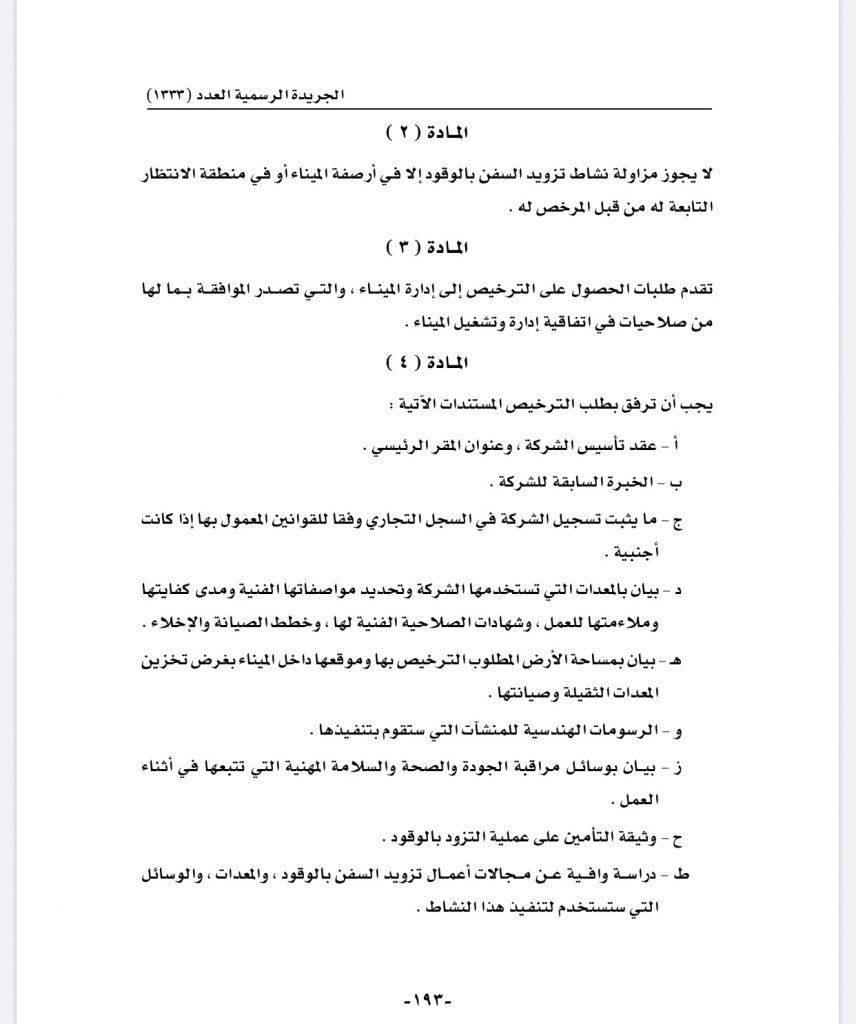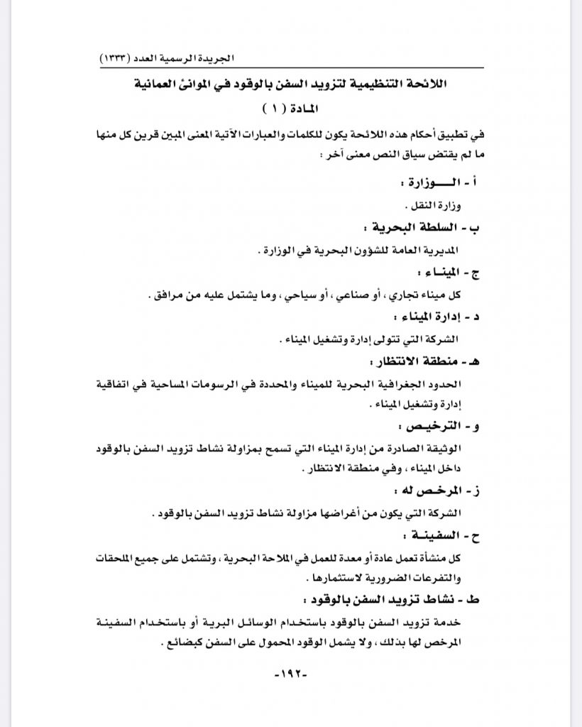 المادة الأولى : يعمل بأحكام اللائحة التنظيمية لتزويد السفن بالوقود في الموانىء العمانية ، المرفقة .