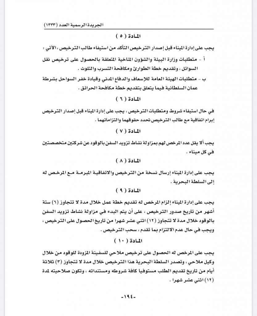 استنادًا إلى القانون البحري الصادر بالمرسوم السلطاني رقم ٣٥ / ٨١ ، وإلى قانون تنظيم الملاحة البحرية في المياه الإقليمية الصادر بالمرسوم السلطاني رقم ٩٨ / ٨١ ، وبناء على ما تقتضيه المصلحة العامة ، تقرر :