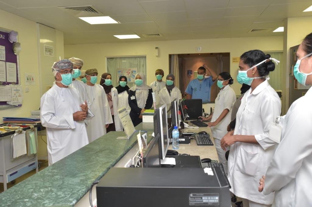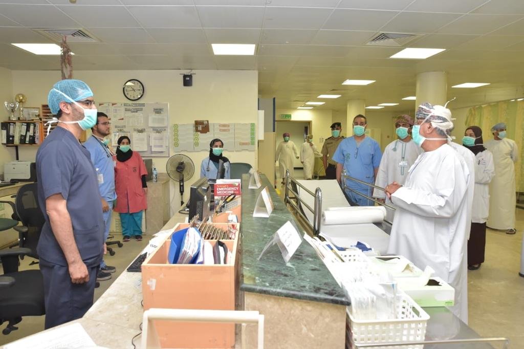 ضمن إطار استمرار جهود وزارة الصحة للحد من انتشار فيروس كورونا كوفيد (2019) قام معالي الدكتور أحمد بن محمد بن عبيد السعيدي -وزير الصحة – بزيارة ميدانية لكل من مستشفى النهضة ومركز إدارة البيانات الخاصة بفيروس كوفيد19 بمحافظة مسقط، وقطاع الاستجابة الطبية والصحة العامة، وذلك للاطمئنان والاطلاع على كافة الإجراءات الاحترازية والتدابير الصحية والوقائية التي تم اتخاذها والتأكد من تنفيذها وفق الخطة المعتمدة للاستجابة لطوارئ الصحة العامة لفاشية كورونا.