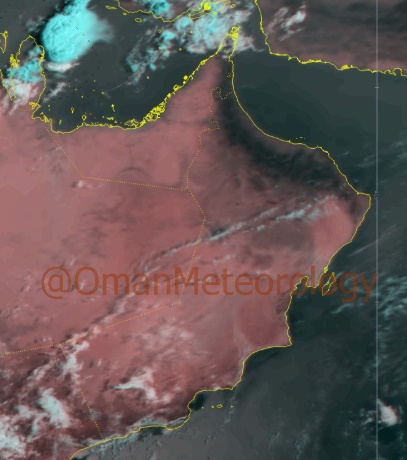أوضحت المديرية العامة للأرصاد الجوية أن الصورة الجوية توضح تدفق وتكاثف السحب على محافظتي مسندم وظفار مع فرص لهطول أمطار وفرص لنشاط التدريجي للسحب على محافظات البريمي والظاهرة والداخلية وشمال وجنوب الباطنة ومسقط وشمال وجنوب الشرقية مع أمطار متفرقة تكون رعدية أحيانا لاحقا.