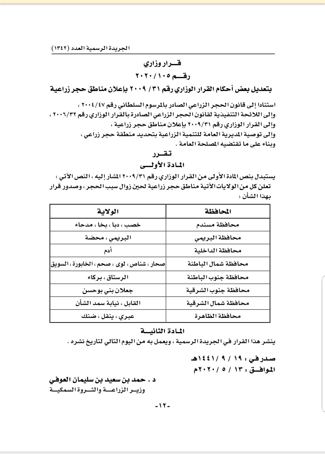 أصدر معالي الدكتور حمد بن سعيد بن سليمان العوفي وزير الزراعة والثروة السمكية قرارا وزاريا رقم 105 / 2020 بتعديل بعض أحكام القرار الوزاري رقم 31 / 2009 بإعلان مناطق حجر زراعية، وجاء فيه كما نشر اليوم في الجريدة الرسمية: