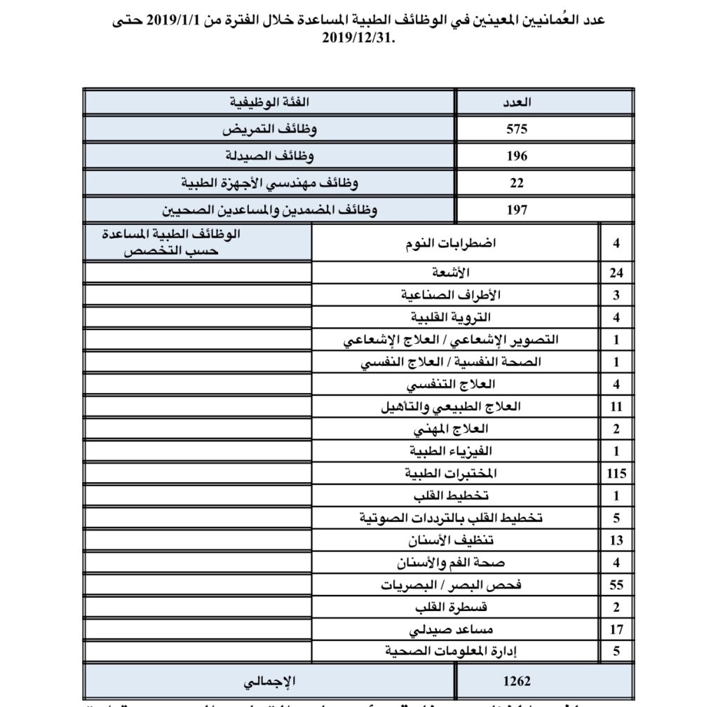 وأضاف : على صعيد آخر قامت الوزارة خلال العام المنصرم وبالتحديد خلال الفترة 1/1/2019 حتى 31/12/2019 بتعيين عدد (1262) خريجا من المخرجات الطبية المساعدة سواء على مستوى البكالوريوس أو الدبلوم، كما يوضح الجدول أدناه: