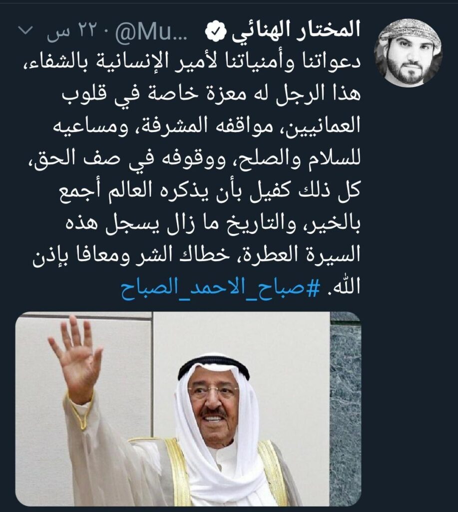 حيث غرد يوسف بن على البلوشي: العمانيون يدعوا لأمير السلام أمير الكويت بالصحة والعافيه …هنا نتحدث عن لغة الحب التى يزرعها الأنسان في قلوب الاخرين حتى وإن لم يكن هناك تعامل مباشر معه فالله إذا أحب عبدا زرع حبه في قلوب الناس ..طهور يا أمير السلام أمير الأنسانيه.