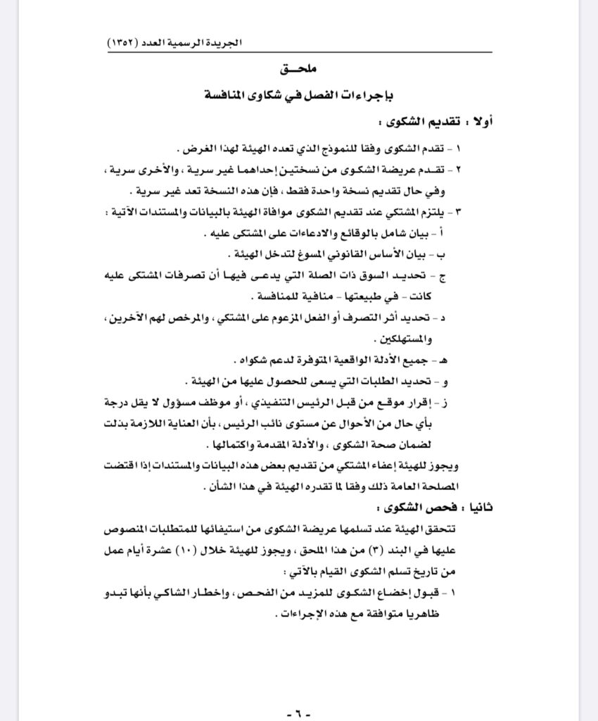 المادة الثانية : يضاف إلى قواعد التنظيم اللاحق للسوق ” التصرفات المنافية للمنافسة ” المشار إليها ، ملحق بإجراءات الفصل في شكاوى المنافسة ، على النحو المرفق .