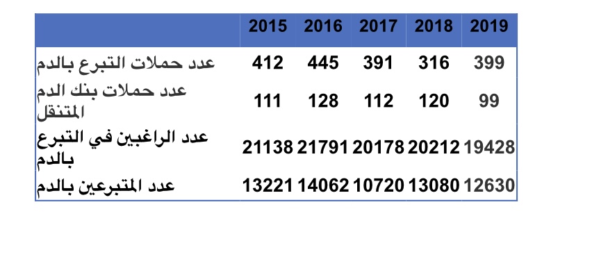 كما وصلت عدد حملات التبرع بالدم المنظمة بواسطة بنك الدم المركزي ببوشر إلى 399 حملة و 99 حملة نظمت بواسطة بنك الدم المتنقل وقد تبرع بهذه الحملات 12630 متبرع بالدم فيما كان عدد الراغبين بالتبرع بها 19428 شخص والجدول التالي يوضح الأرقام خلال السنوات ( 2015م – 2019م ):