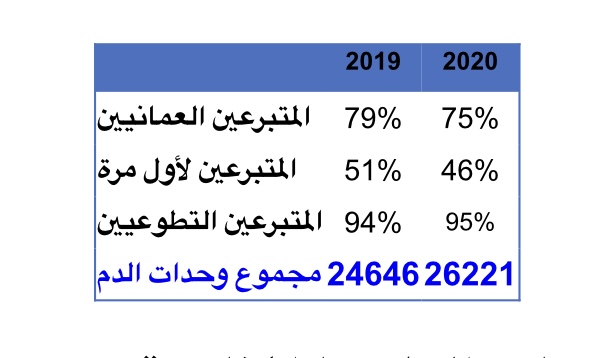 إلا أن المؤشرات والإحصائيات تشير إلى زيادة عدد وحدات الدم المجمعة خلال نفس الفترة، والجدول التالي يوضح مقارنة في الأعداد بين عامي 2019م و2020م للفترة من 1يناير إلى 30 نوفمبر: