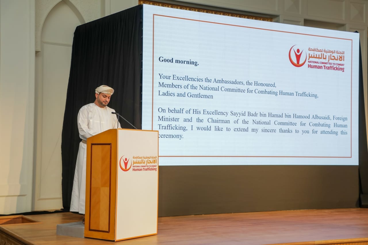 من جانبه ألقى سعادة نصر الصواعي كلمة أمام الحضور قال فيها: “إن السلطنة مؤمنة بضرورة أداء دورها في الجهود العالمية لمكافة الاتجار بالبشر، لما تشكله هذه الآفة من خطر على النسيج المجتمعي على المدى القريب والبعيد، ولذلك كانت من أوائل الدول التي أصدرت تشريعاً خاصاً للقضاء على هذا الانحراف الجرمي، وهو قانون مكافحة الاتجار بالبشر الصادر بموجب المرسوم السلطاني رفم (126/2008) الذي نصت فيه المادة (22) على تشكيل لجنة وطنية من عدة جهات حكومية، تختص بوضع خطة وطنية لمكافحة الاتجار بالبشر عالية المستوى.
