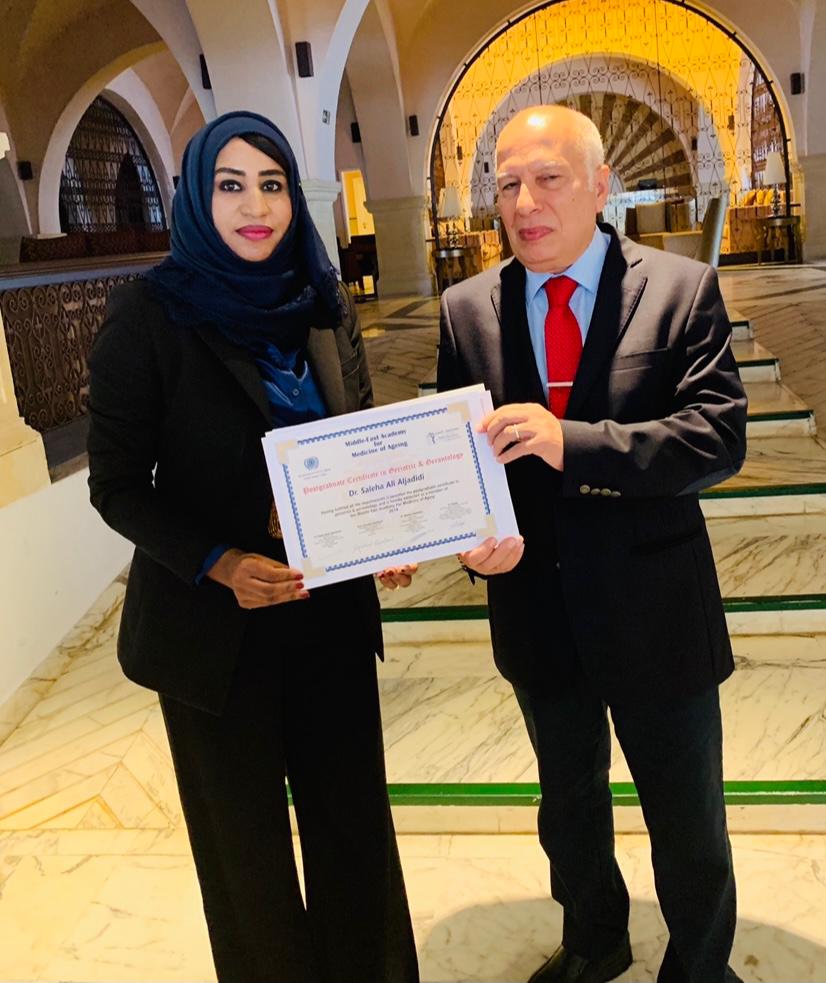 تعد الدكتورة صالحة بن علي الجديدية إستشارية الطب النفسي وصحة المسنين بمستشفى المسرة أول طبيبة عمانية تحصل على شهادتين فى مجال الشيخوخة، وهما: الطب النفسى للمسنين، وطب الشيخوخة وذلك جامعة مجيل الكندية واكاديمية الشرق الاوسط.