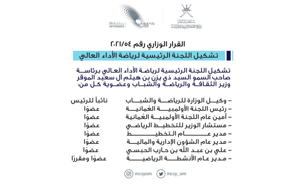 أصدر صاحب السمو السيد ذي يزن بن هيثم وزير الثقافة والرياضة والشباب قرارا وزاريا بتشكيل اللجنة الرئيسيّة لرياضة الأداء العالي متوافقًا مع أهداف ورؤية عمان ٢٠٤٠؛ لجعل السلطنة في مصاف الدول المتقدمة في المجال الرياضي.