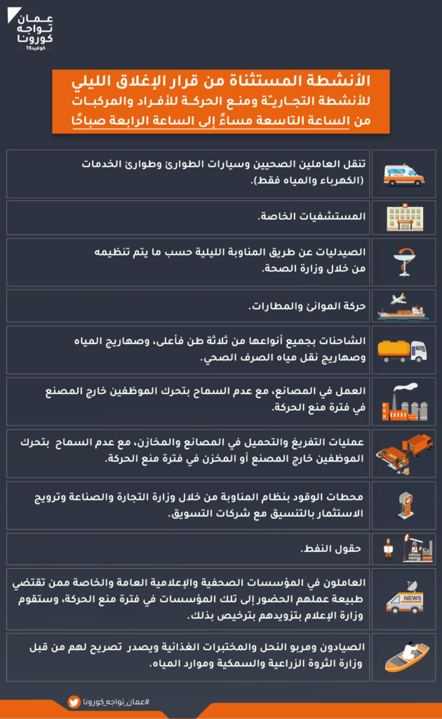 نشر حساب “عمان تواجه كورونا” الرسمي الأنشطة المستثناة من قرار الإغلاق الليلي من الساعة التاسعة مساءً إلى الساعة الرابعة صباحًا خلال شهر رمضان المبارك.