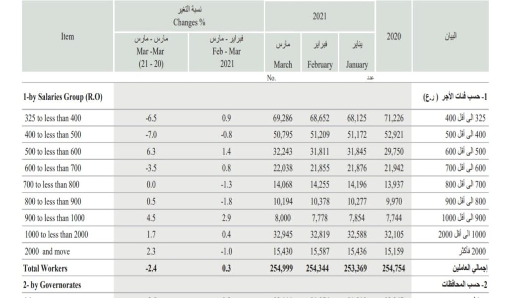 بلغت إجمالي الأيدي العاملة الوطنية في القطاع الخاص 254 ألف و999 عمانياً بنهاية مارس المنصرم بحسب النشرة الشهرية للمركز الوطني للإحصاء والمعلومات، بزيادة قدرها 655 عمانياً مقارنة بشهر فبراير المنصرم، وبنسبة ارتفاع 0.3%.وذكرت الإحصائيات أن الأيدي العاملة الوطنية بنهاية عام 2020 بلغت 254754 عمانياً وشهد هذا الرقم تراجعاً كبيراً في يناير الماضي بنحو 1385 عمانياً أي ما مجموعه 253369 من الكوادر الوطنية في القطاع الخاص، وعاود الرقم في الارتفاع خلال شهري فبراير ومارس الماضيين بحسب المركز الوطني للإحصاء والمعلومات.