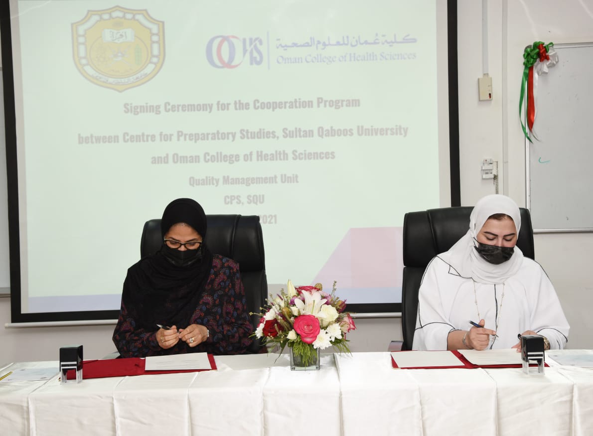 وقعت كل من الجامعة وكلية عُمان للعلوم الصحية برنامج تعاون ضمن إطار تبادل التجارب والممارسات والخبرات العلمية فيما يتعلق بالبرنامج التأسيسي العام، وقد قامت بالتوقيع من جانب الجامعة المكرمة بدرية بنت إبراهيم الشحية- مديرة مركز الدراسات التحضيرية نائبة رئيس مجلس الدولة، ومن جانب كلية عُمان للعلوم الصحية الدكتورة ليلى بنت موسى الزدجالية -مديرة دائرة الجودة بالكلية وذلك نيابة عن الأستاذ الدكتور مصطفى فهمي محمد- عميد الكلية.