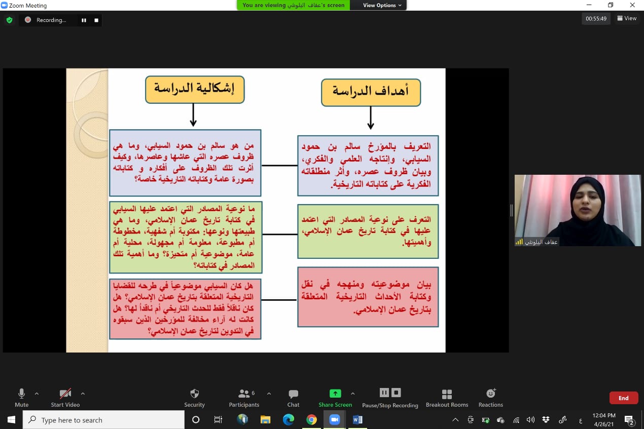 اجازت جامعة السلطان قابوس ممثلة بقسم التاريخ بكلية الآداب والعلوم الاجتماعية رسالة الماجستير للطالبة عفاف بنت خميس بن عبدالله البلوشية، بعنوان سالم بن حمود السيابي (1908-1993م)، مصادره ومروياته ومنهجيته في كتابة تاريخ عمان الإسلامي.