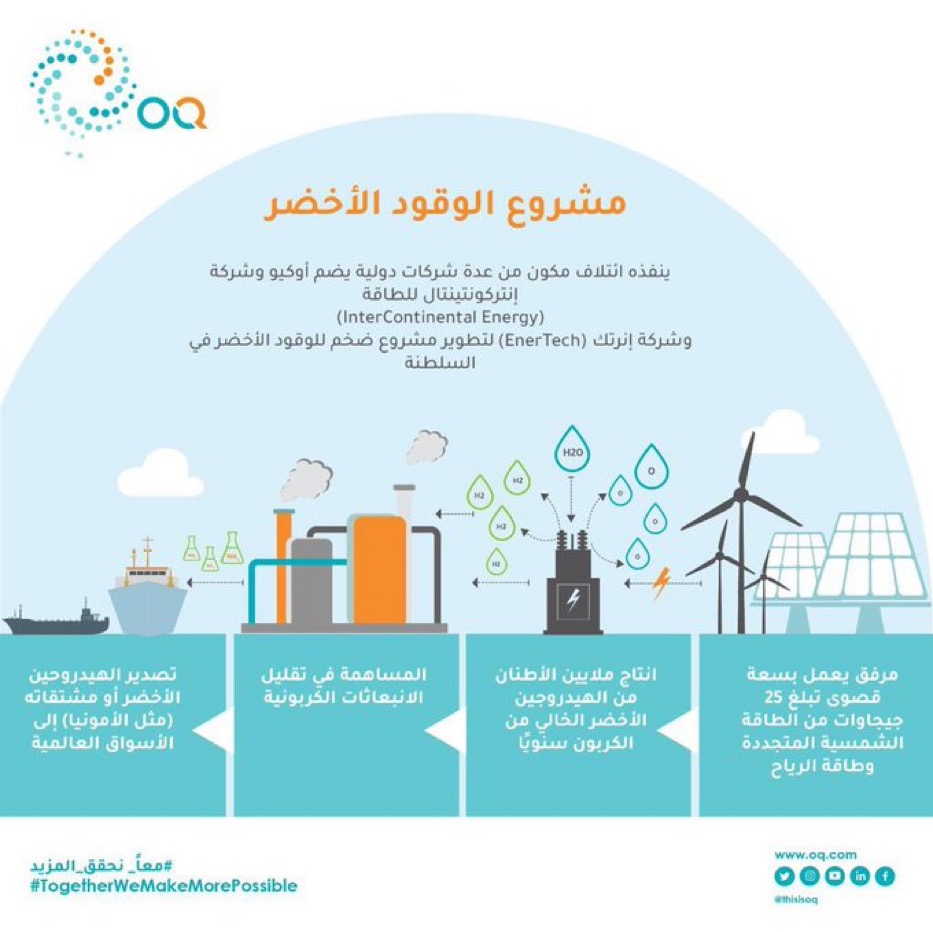 تم الإعلان عن بدء تطوير مشروع الوقود الأخضر بجنوب شرق محافظة الوسطى سيضع السلطنة على الخارطة العالمية لإنتاج الهيدروجين والأمونيا الخضراء عبر إنتاج ملايين الأطنان من الوقود الأخضر الخالي من الكربون سنويًّا.
